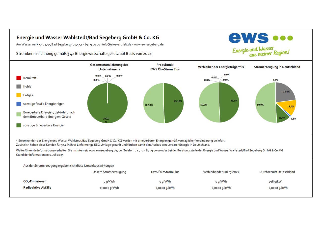 Alle Stromversorger sind durch das Energiewirtschaftsgesetz (§ 42) aufgefordert darzulegen, wie sich der von ihnen gelieferte Strom im Energiemix zusammensetzt und welche Umweltauswirkungen damit verbunden sind. Gerne kommen wir dieser Verpflichtung nach.